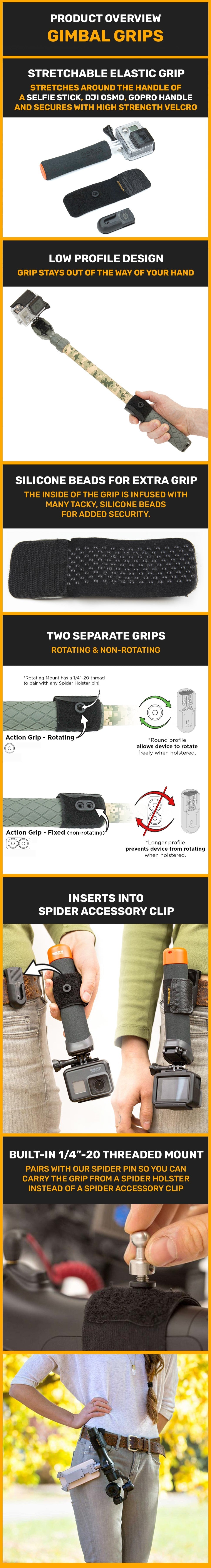 Take your GoPro™ or DJI Osmo™ anywhere with our Spider Gimbal Grips! Holstering your action camera gives you quick, easy access, and is a safe, ergonomic way to carry your gear.