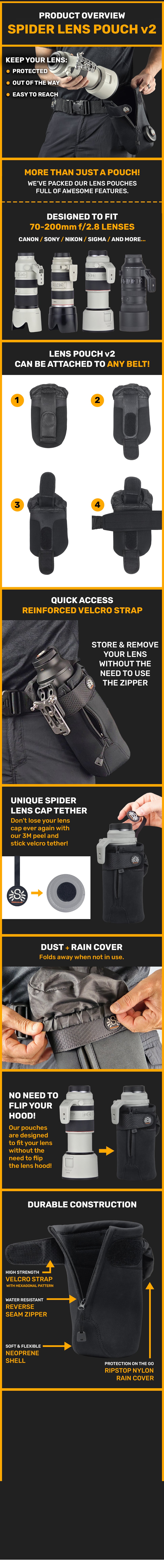 The SpiderPro Lens Pouch v2 shares many of the great features of the original such as the built-in rain cover, lens cap tether and heavy duty zipper.