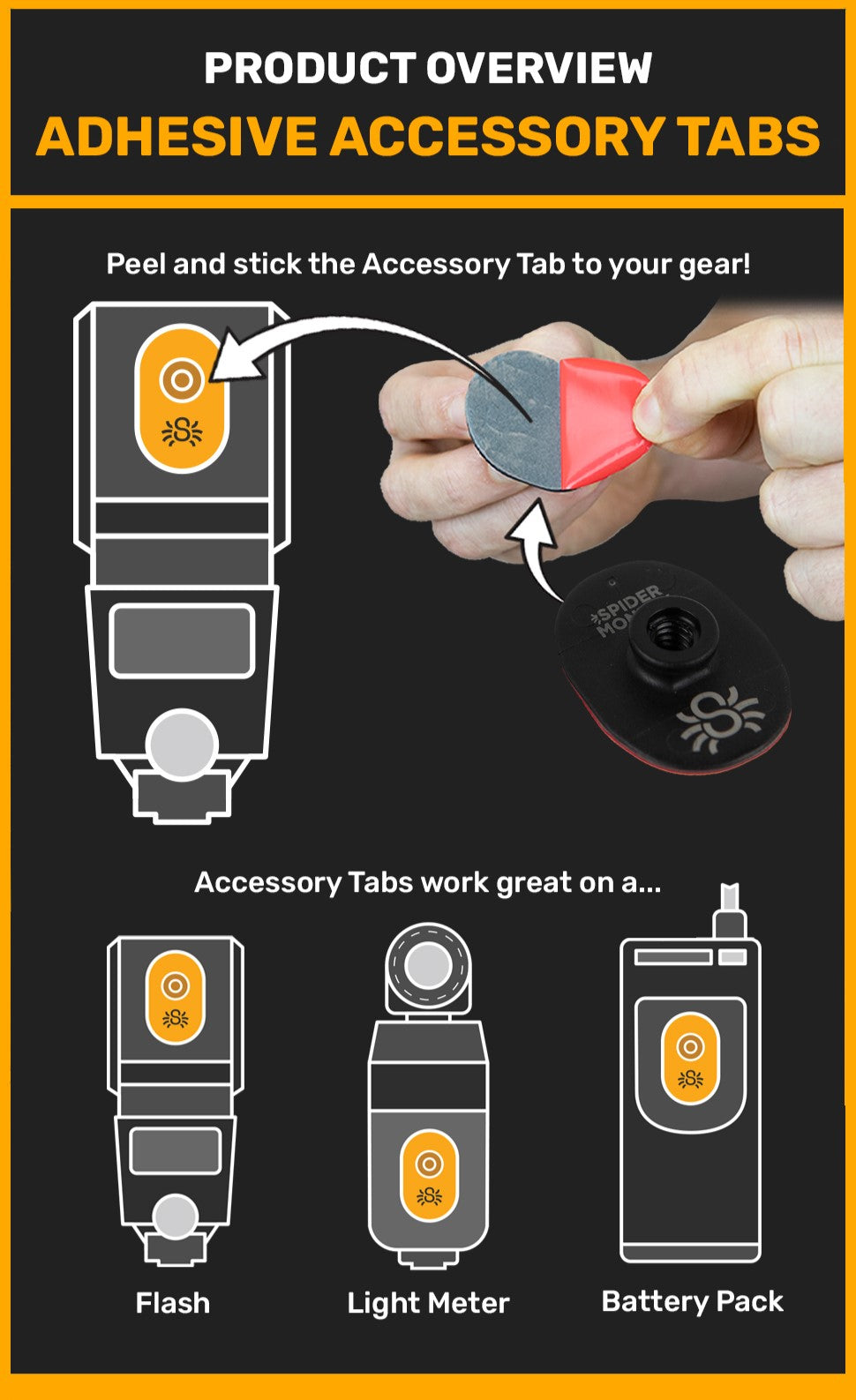 The Spider Adhesive Accessory Tabs attach to any lightweight accessory with a flat or slightly curved surface using a high-strength 3M adhesive.