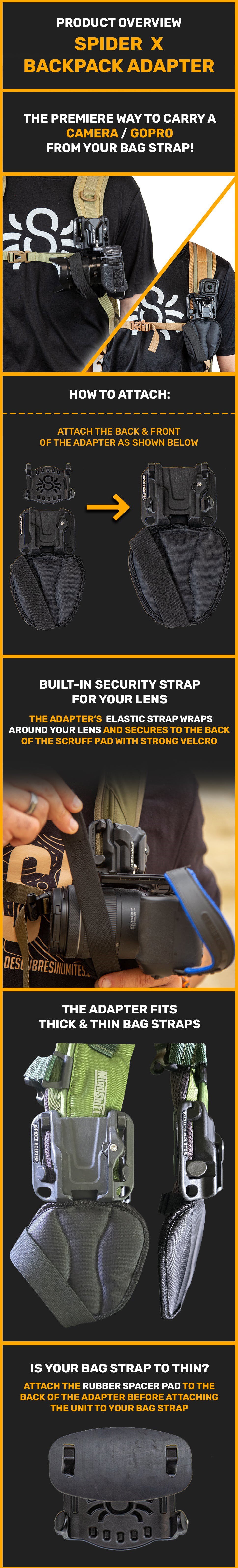 - The Backpack Adapter is compatible with SpiderLight or Spider X Camera Holsters and allows you to easily and securely clip your holster into the Backpack Adapter.