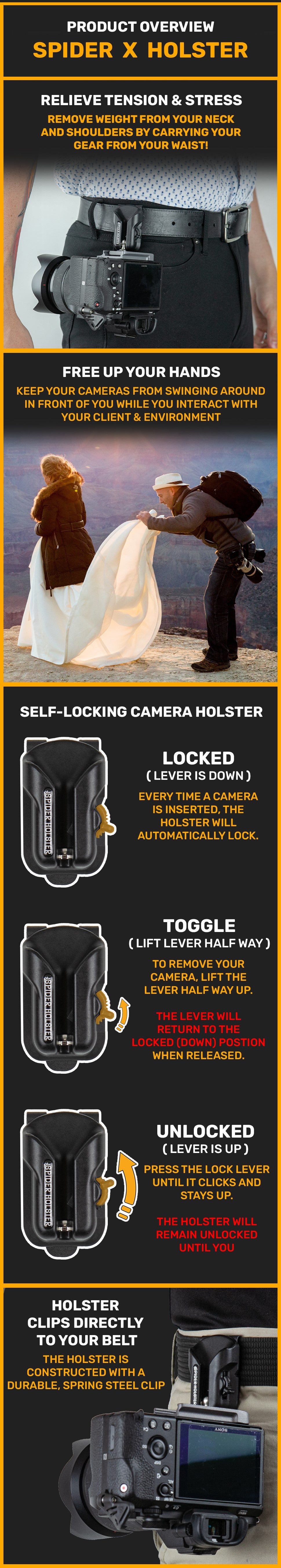 Position 1: Auto-Lock Mode – As soon as a Spider v3 Plate Pin or other Spider v3 Accessory is inserted, the holster lock automatically engages, securing your camera. To release, lift the lever and remove your camera. The holster will return to its Auto-Lock Mode.