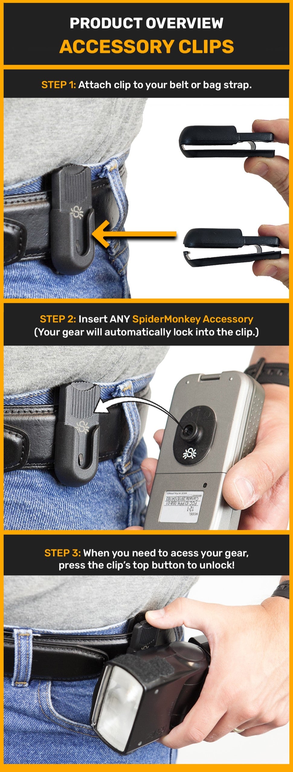 The reinforced polymer Spider Accessory Base Clip attaches to any belt (up to 2 inch height), pocket, or backpack strap and lets you quickly swap out your gear with the press of a button.