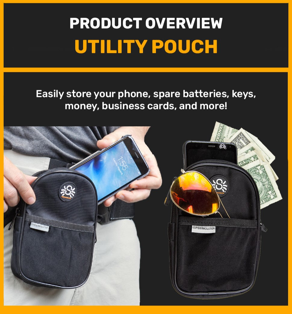The Utility Pouch is designed with dual zippers for easy access and has two internal compartments: one for your phone and one for your cash, keys, batteries, memory cards, etc.